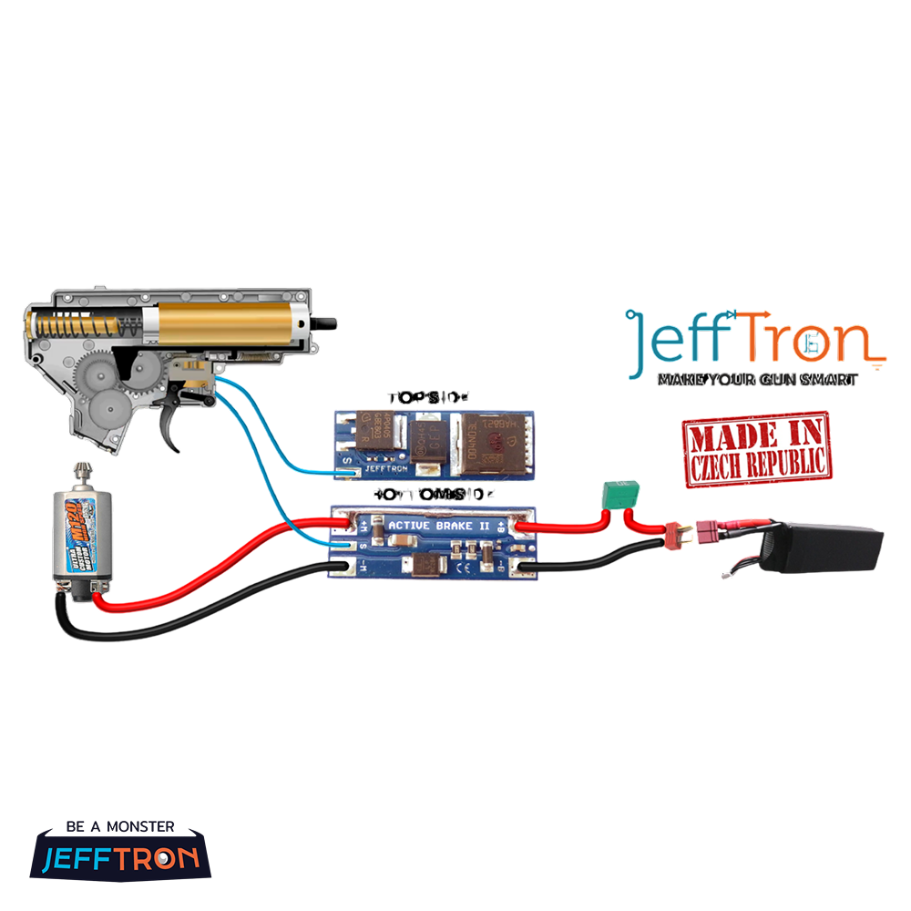 The JeffTron Active Brake II is a compact and powerful active braking MOSFET designed to instantly stop the motor after each trigger pull, improving shot consistency and preventing overspin in AEG airsoft replicas. By cutting motor inertia at the end of the firing cycle, this unit helps ensure reliable semi-auto performance and protects internal components from unnecessary stress.